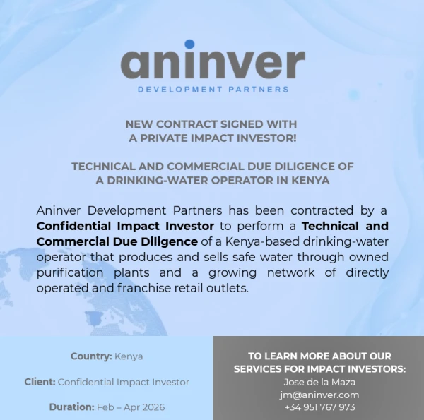 Aninver has signed a new contract with a Confidential Impact Investor to deliver Technical & Commercial Due Diligence in the WASH sector in Kenya, supporting an investment decision with a strong focus on impact integrity and risk management.