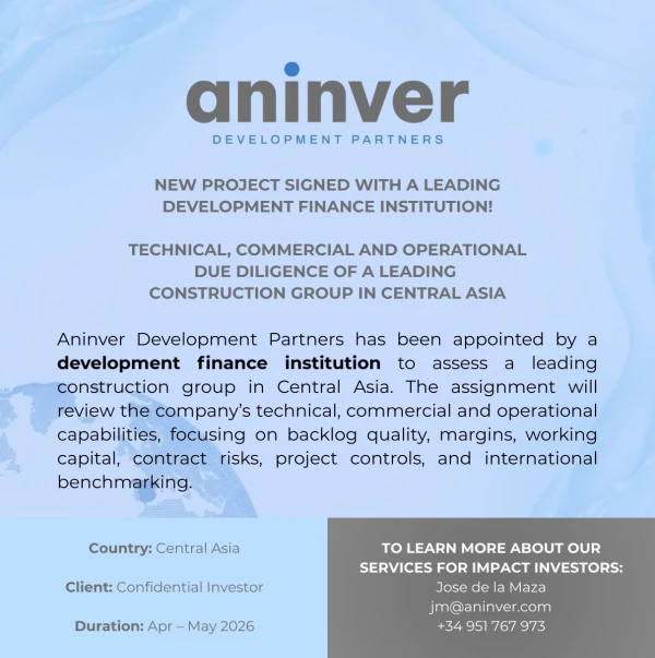Aninver Development Partners is pleased to announce a new engagement with a confidential development finance institution to deliver technical, commercial and operational due diligence for a leading construction group with activities in Central Asia. The assignment will be implemented over 6 weeks and will provide an independent assessment of execution capacity, backlog quality, margin sustainability, working capital resilience, project controls and contract risk.