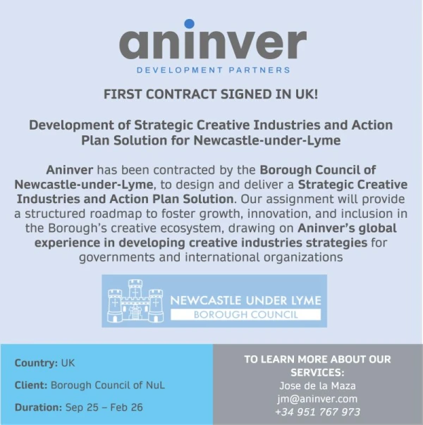 Aninver Development Partners is thrilled to announce the award of our first project in the United Kingdom, marking an exciting expansion of our work in the cultural and creative industries sector. We have been commissioned by the Borough Council of Newcastle-under-Lyme to design and deliver a Strategic Creative Industries and Action Plan Solution that will help unlock the Borough’s creative potential, drive innovation, and strengthen its cultural ecosystem.